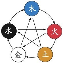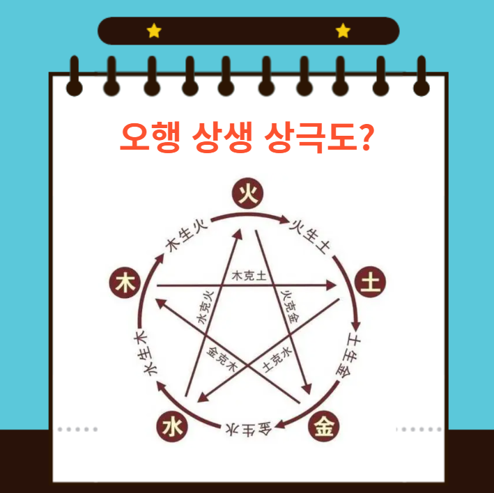 "오행"은 목(木나무), 화(火불), 토(土흙), 금(金금속), 수(水물)이라는 요소로 구성되는데 한국 전통 우주론의 초석을 형성하고 의학, 철학, 무술, 서예 등을 포함한 한국 문화의 다양한 분야에 배어있습니다.