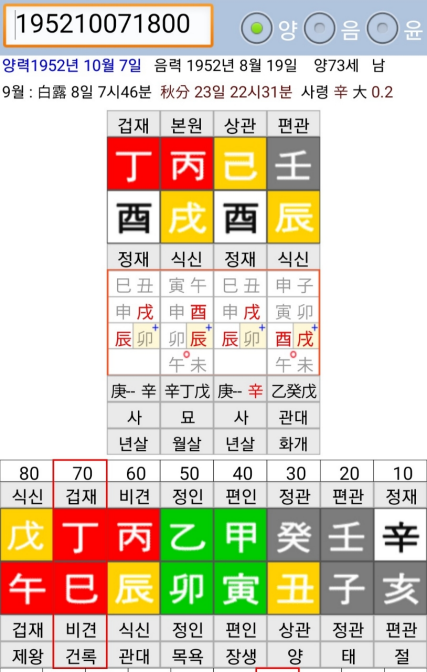 위의 명조는 근대 중국 명리학사의 한 획을 그은 서락오님의 친구 명조라고 하는데, 금수운에 부유하였으나 정미대운에 사망하였다고합니다.