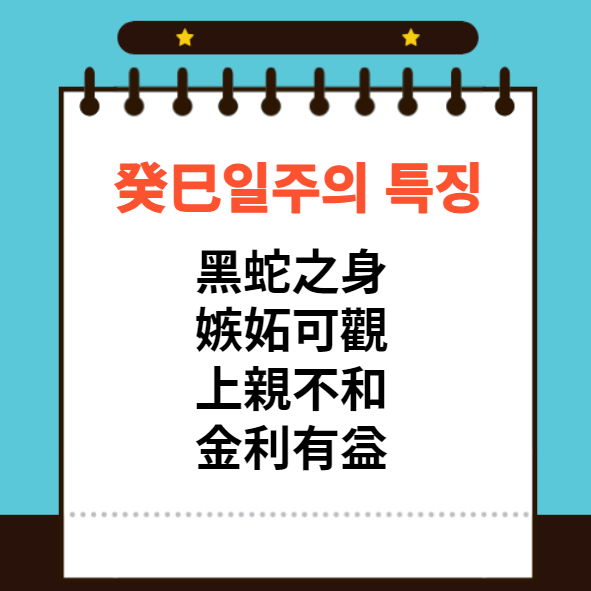 속을 알 수 없는 검은뱀과 같고 질투심을 잘 드러내며, 권력지향적이라서 윗 사람과 화합하기 어렵다고 합니다.