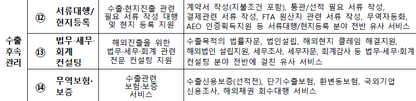 수출 단계별 즉 수출준비, 수출이행, 수출후속관리로 구분하여