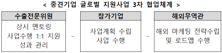 지원내용 : 참가기업 – 수출전문위원(KOTRA본사) - 무역관(KOTRA해외)