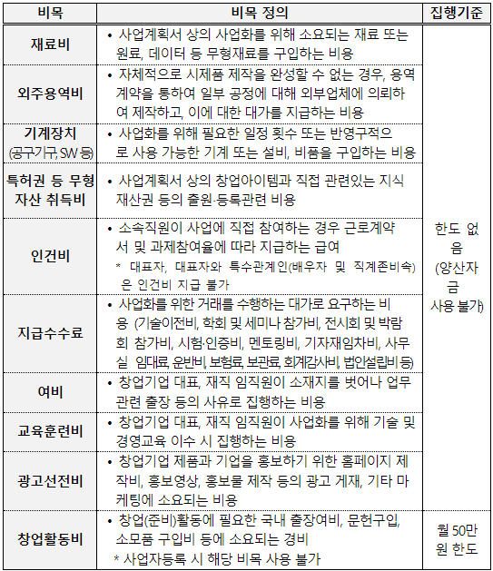 사업화 자금 ** +** 창업 프로그램 시제품 제작, 마케팅, 지식재산권 출원‧등록 등에 소요되는 사업화 비용 지원 BM구체화, 온-보딩 (정착)지원, 기초‧실무교육, 멘토링, 네트워킹, 투자유치연계 등 역량강화 지원 * 평가결과에 따라 차등 지원 * 주관기관별 프로그램 참고 [별첨 2] 구 분 지원 세부 내용 사업화 자금 • 사업화 자금 (평균 46백만원, 최대 70백만원) 지원 : 시제품 제작, 지재권 취득, 사업모델 (BM) 개선 등에 활용 * 선정평가 결과에 따라 사업화 자금 차등 지원 ** 사업화 자금(정부지원사업비)은 예비창업자의 신청금액 범위 내에서 지급 • 총사업비 = 정부지원사업비 100% (자기부담사업비 없음) < 비목정의 및 기준 (세부기준 선정자 별도 안내) >