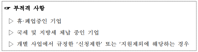 비율이 다르므로 개별 사업공고를 반드시 참조ㅇ 지원제외 : 다음 부적격 사항에 해당하는 경우