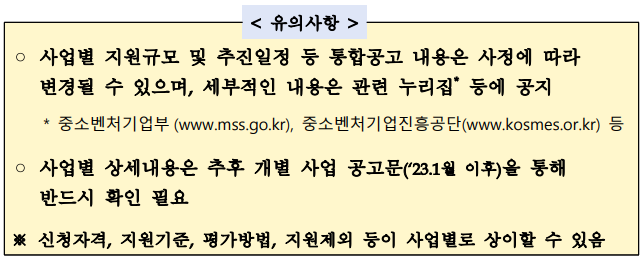 ※ 사업별 지원규모 및 추진일정 등 통합공고 내용은 사정에 따라 변경될 수 있음지원사업이 개별로 공고되어 정신을 바짝 차리고 점검하지 않으면 놓치기 쉽겠네요..